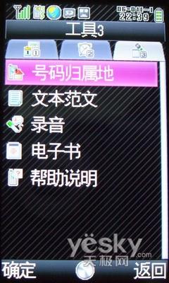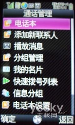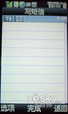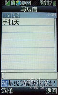 电话功能上SH6018c并没有大的变化,良好的通话性能和多达500组的通讯录仍得以保留,所以作为一款移动电话,SH6018c的表现还是很不错的。短信方面,SH6018c支持短信息、彩信及电子邮件功能,但是SH6018c内置存储短信息只能达到180条,彩信只有956K容量,基本限制在100条左右,使用上还是有点捉襟见肘。SH6018C支持新版T9拼音输入法,汉字输入速度在熟悉使用后非常快。