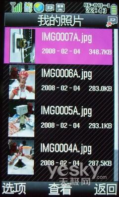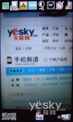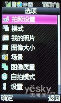 SH60180c配置一颗可自动对焦的320万像素摄像头,拍照界面的上下方分别为当前设置的参数,用户可以进入设置界面对拍照模式,曝光,白平衡等进行设置。同SH6010c一样,当按下导航键中间的确定键时,摄像头会先进行自动对焦在拍摄,也可以先按下通话键进行对焦再按确定键拍摄。
