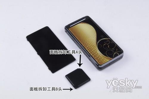 将工具的A端塞入拆卸孔,将前面板顶出来