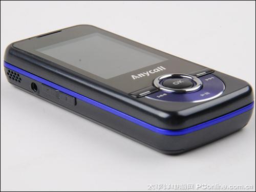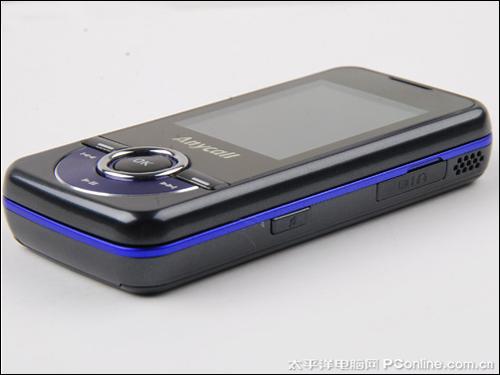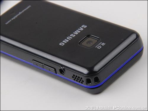 三星M2710C对于扬声器的处理还比较传统,左右分置扬声器,另一方面,一般机型上常见的拍照快捷键,在手机上被换成了音乐播放快捷键,存储卡的接口也没有出现在手机边上,取而代之的是数据线接口。