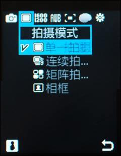在拍照选项中,M2710C提供了足够多的设置,长按快门键可以进入拍摄界面,全屏取景,屏幕够大所以感觉很舒服。上方是简单的状态指示,左下方是浏览照片的按钮,右下方的小扳手是设置。拍照模式支持照片、计时器、连拍、边框、全景、微笑模式、录像、彩信录像。