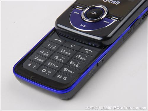 三星M2710C作为三星全新的音乐系列机型,自然在音乐播放上进行了全面优化。在快捷菜单附近取消了常见的接听和挂断按键,而改成了音乐快捷播放按键,在不用打开滑盖的情况下,就可以完成音乐播放的操作。手机左侧分别排列了3.5mm耳机插孔,音量控制键和外置扬声器,比起其他音乐机型在耳机插孔上的不变,三星M2710C进步不小。