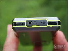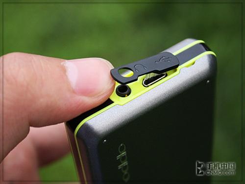 底部分布了OPPO P51的主要数据接口——2.5毫米耳机接口和microUSB接口。保护盖为耳机接口专门开了小口,这样即使不打开保护盖也可以使用耳机插孔,是比较方便的设计。在保护盖的右侧后盖处有个很小的缺口,这里实际上是挂绳孔,设计得很隐蔽。