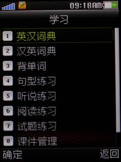 其中,学习菜单时非常实用的一项,特别是对于学生群体,包含了英汉词典和英语练习的功能,要使用这些功能必须首先保证有这些功能课件置于卡中。