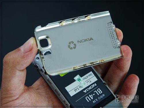 打开来看诺基亚6600i的金属后盖,后盖结构紧凑,边上的扣件为焊接而成,中间标注有可回收的标识,这也是金属材质的另一个好处,材料回收更方便。