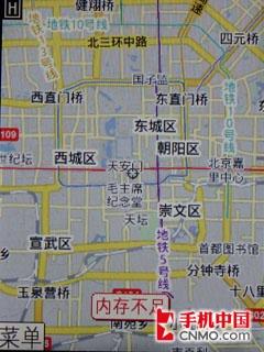 使用Google地图时,查看卫星地图变成一件很惬意的事情,下载一屏的内容仅需几秒钟的时间。如果是在地图模式,查看实时路宽也非常方便(如右图)。不过有一点不足是,由于诺基亚6600i运行内存较少,在打开较多内容后,会提示内存不足。