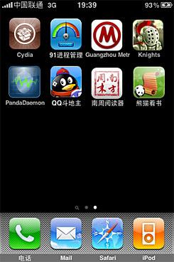 越狱后的联通iPhone 3GS可以顺利安装各种常用的程序软件,比如QQ游戏和熊猫看书等等。
