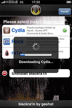 完成越狱之后,在功能表里点击blackra1n图标,进入balckra1n按图标指引安装Cydia及相关补丁,以便其后iPhone 3GS与电脑端的91手机助手连接,安装更多的免费破解软件游戏。