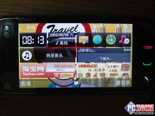 诺基亚N97和N97 mini的Widgets系统可以让我们更合理的利用主待机屏幕的空间,可以是一些辅助系统的小工具,也可以是互联网信息内容的快捷显示。行货版本的N97和N97 mini已经预置了10个中国地区最为流行的互联网应用,从图片上我们已经可以看到新浪新闻以及淘宝网的相关内容,此外还有新浪财金、大智慧、张小盒、携程网、时尚网……等流行内容。通过这些Widgets我们可以比浏览器访问网站更为快捷的获取相关的信息,从而活得更好地移动互联网使用体验。当然,如果你不想使用联网相关的内容,你也可以替换成系统相关的诸如常用联系人电话、音乐播放快捷控制或是应用程序快捷方式等内容。