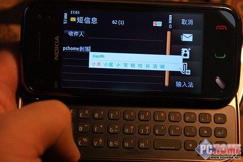 说到键盘我们就来说一下输入法。诺基亚N97 mini还是沿用了源自S60V3.2平台的键盘拼音和笔画输入,支持词组输入和智能联想。不过从个人的使用习惯出发,我更喜欢使用点讯、搜狗、A4这样的第三方输入法,一来词库更加丰富,二来在中文联想上要比S60的自带输入法更贴合我的中文使用习惯。不过目前以我喜欢的搜狗输入法来说,由于键盘键位的不同,搜狗的N97专用版并不能和N97 mini通用。小编我自己是通过朋友对N97专用版的搜狗输入法进行了些程序上的修改才在N97 mini上实现了键位的对应——这样一来输入就顺畅很多了。我比较建议诺基亚考虑下多普达的做法,和本土的第三方输入法合作,内置在手机内作为官方输入法,比如说多普达就与上海点讯合作,使得多普达的PPC手机让许多普通用户一下子觉得好用了很多,这种做法我觉得是诺基亚在本土化的进程中可以借鉴的。