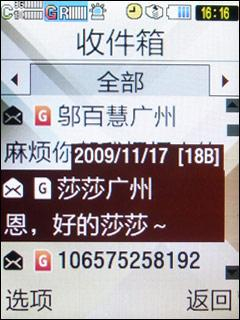 由于W589的实体按键键程较大,因此用它来发短信非常舒适,输入速度也因此会有所提升。不过该机的短信界面把发送按键设置为确认键,因此在选字的时候要格外小心,万一多按了一下信息就发送出去了。另外,短信编辑框下面的电话本、群组、近期联系人、键盘这一栏的按键需要触摸操作,键盘无法实现这些功能。
