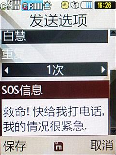 三星W589还有一个有趣的短信功能:SOS短信(紧急求救短信)。该项功能需要预先设置求救短信接收者以及短信内容,万一遇到紧急情况只需要连续按三下减少音量键,短信就悄悄地发送出去了。短信发送后手机会进入所谓的“假死”状态,只有按了挂机键后才能重新激活手机。