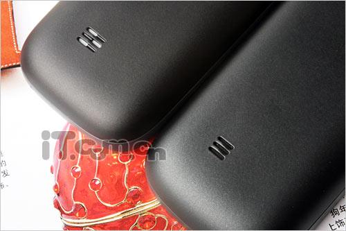 诺基亚2700c和2730c背面都采用了黑色磨砂塑料打造,手感上非常不错,也有效地起到了防滑作用。背面上看两者的摄像头和LOGO都一模一样,唯一的不同还得仔细观察才能发现,扬声器虽然都为三孔式设计,但不同的是2730c内置了金属防尘网,比2700c看起来更加美观。