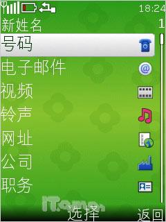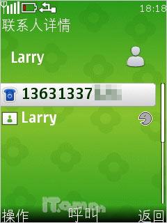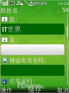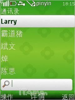作为定位低端的手机,基本功能当然是消费者关注的重点,而在这方面诺基亚一向都是做得不错的。传统的名片式的电话本一目了然,支持在每个联系人目录下添加姓名、多个电话记录和电子邮件,同时还可以通过左键添加更多详细信息。手机内存共享的电话薄存储方式可以满足一般用户的需求,同时拼音首字母的搜索也是相当方便。