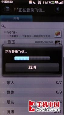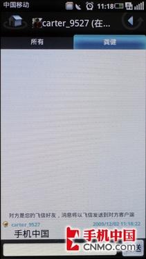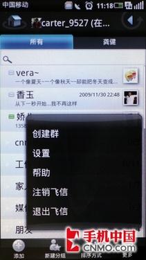 对于中国移动用户而言,飞信软件的普及程度自然不必多说,通过GPRS网络进行免费的信息发送对大多数用户而言十分受用。相比之下,由于没有方向按键配备,所以戴尔Mini 3i的飞信体验完全通过触控实现。不过点选“返回”图标后,飞信程序会进行后台运行,而并非直接退出。