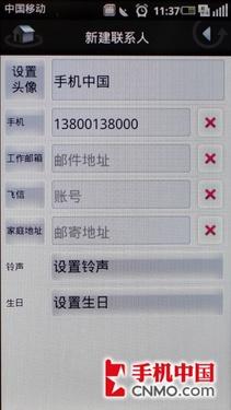 用户可以在联系人名录下存储手机、工作邮箱以及飞信、住址等详细信息,此外,还可按下菜单键,选择增加更多详细信息。