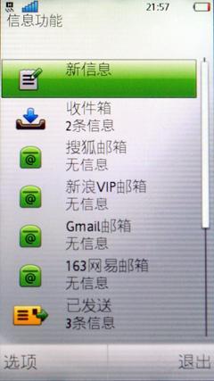 1.通讯基本功能:手机的信息功能中整合了SMS短信功能以及电子邮箱功能。进入信息功能之后,除了传统短信的新信息、收件箱等选项外,还默认内置了搜狐邮箱、新浪VIP邮箱、Gmail邮箱以及163网易邮箱四种常用的邮箱,也是行货提供的便捷服务之一,方便用户选择使用,省去了不少用户自己配置的步骤。