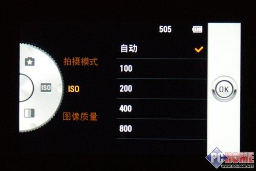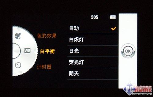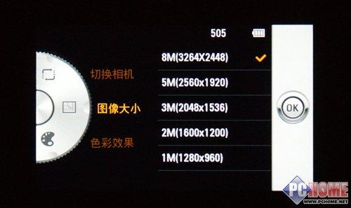 GD900e的拍照功能界面,是采用类似DC的拨盘式操作,最大支持拍摄3264×2448像素的照片和720x480分辨率的视频拍摄。拍照功能方面支持防抖、特效、白平衡、计时器、连拍等功能。ISO最大可到800,白平衡有白炽灯、日光、荧光灯、阴天可选。还支持自动对焦有人脸跟踪、单点测光等。