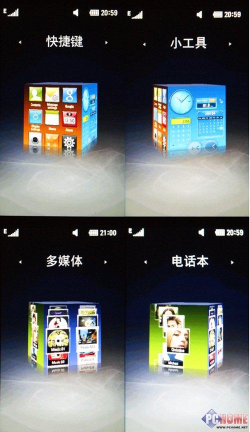 S-Class是LG全新开发的3D用户操作界面,其核心操作包括三维快捷面板和拥有32个功能项的主菜单。三维快捷面板包括了“快捷键”、“多媒体”、“电话薄”和“小工具”。这四大快捷面板可自定义,也可在桌面通过手指左右滑动进行切换。同时,四大快捷面板,可以在按下屏幕下方中间的cube键后一键切换为三维立方体的四面,同样利用手指左右滑动切换,更加快速准确。