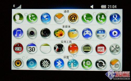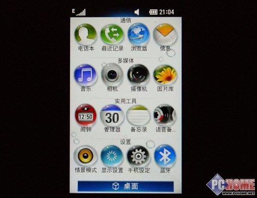 S-Class的另一个核心操作是包括32个功能图标的主菜单项,我们可以通过屏幕下方四个快捷图标的最后个进入到主菜单界面。竖向显示时,32个图标分为“通信”、“多媒体”、“实用工具”、“设置”四行,每行显示四个并隐藏剩下的四个图标,一共显示16个图标,可由手指左右滑动选择另外的四个程序图标。如果开启了重力感应,把手机横过来后,32个程序图标完全呈现,无需选择繁琐的子菜单,任何设置和功能都可一触抵达。