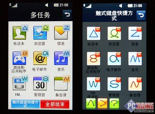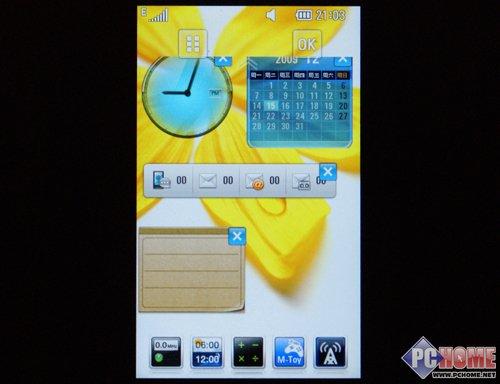 除了这两项核心菜单形式,S-Class界面还有更多贴心设计,如底部的通讯专用功能项,另外点击顶部状态栏则会快速弹出快捷操作菜单,可快速的进行蓝牙、闹钟、音乐播放器等设置。在S-Class 3D界面中,所有列表项的拖动都可以用手指直接拖拽,与此同时,LG KM900e也具备力回馈技术,触控回馈可以让用户体验到类似物理按键的按压手感。