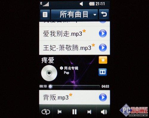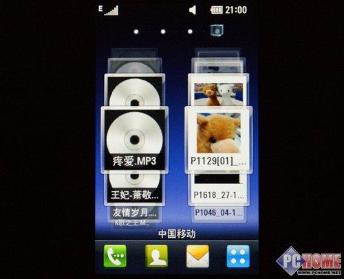 在“多媒体”界面中,我们可以选取多个音乐或图片放在桌面上,在桌面上显示为2列,左边一列为音乐,右边一列为图片。同电话本一样,我们可以选择卷轴式排列图标或者方块式排列图标。在这一界面中,显然是卷轴式的排列法更为方便。在“多媒体”界面中,我们还可以点击歌曲进行快捷播放,点击图片进行快捷浏览。