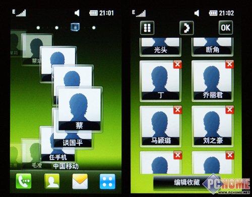 在“电话本”界面中,我们可以直接从通讯录里选取30个常用联系人,放置在桌面上。既可以呈卷轴装排列,也可以以呈现方块状排列。相对来说,卷轴状排列的联系人图标在滑动选取时更加炫目;而方块状排列的联系人图标图标在实际使用中更加方便。