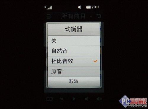 LG GD900e支持MP3等多种时下主流的音频格式播放,支持播放列表编辑,支持后台播放及多种播放模式。与传统手机音乐库不同的是,进入音乐播放器以后,不再有一个传统的播放器界面,还是直接进入到曲库进行点击播放。点击正在播放歌曲弹出伸缩式菜单,菜单背景也有不同的背景可以更换。GD900e的音乐播放器内置了多个均衡器,还搭配了专业的杜比音效,开启杜比音效以后,播放音乐的声场定位变得更加清晰,复杂乐器的分离度更高,优美的音乐被完美演绎,让人完全沉醉其中。