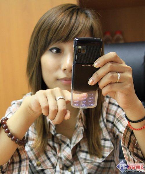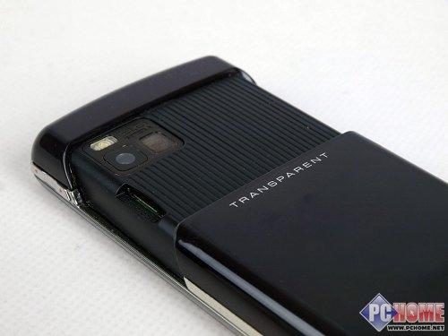 LG GD900e的背面印有“TRANSPARENT”的字样,翻译过来是“透明”的意思,突出了这款手机最大的特点就是透明键盘(由于本次测试的是工程样机,所以机身背面右上角会有“Not For Sale”标识)。后盖采用了从上到下从黑到白到透明的渐变式颜色效果,而底部的白色透明部分正是可以帮助滑出的透明键盘实现透视。另外背面的800W摄像头是隐藏在滑盖里的,这样可以使镜头不被划伤,摄像头旁边同时搭配了一个LED闪光灯和自拍镜。
