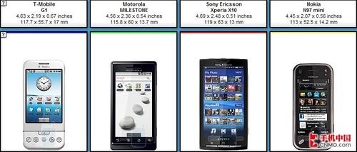 侧面能感受到MOTO Milestone的薄,这里可以相对于主流机型做一下对比。只比索尼爱立信Xperia X10要厚一些,相对于同样是全键盘侧滑盖的N97 mini,MOTO Milestone要薄0.5毫米。