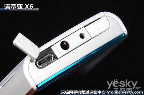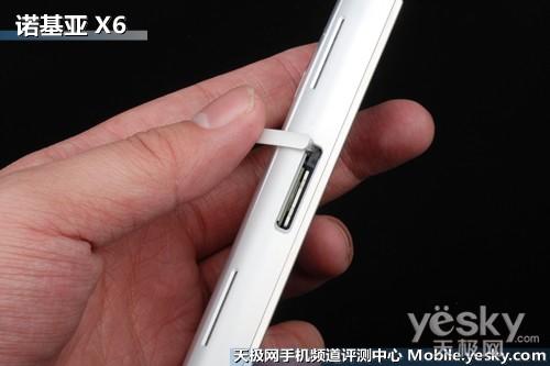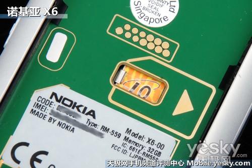 诺基亚X6在机身左侧设计了独立双扬声器,虽然功放音效和音质都令人满意,但两支扬声器都集中在机 身以一侧,想要达到立体声效,还需将手机横置摆放,如果可以引入N96(参数 报价 图片 论坛)、N86上的支架设计,相信可以提升这款手机的功放音乐能力。位于独立扬声器之间的 防尘保护盖下隐藏了SIM插槽,取下电池后,使用SIM卡槽拨片,即可将SIM取出,外露式的SIM卡插槽在5800XM、5530XM(参数 报价 图片 论坛)手机均有体 现,X6内置32GB储存空间,所以省略了储存卡插槽。