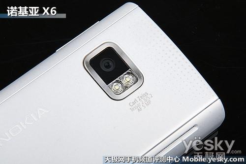 诺基亚X6配置了500万像素卡尔蔡司认证镜头,并搭配双LED补光灯使用,该机最高科拍摄 2592 x 1944分辨率的照片,支持场景模式、色调、拍平衡、曝光、ISO、对比、锐度调节,其中场景模式支持微距拍摄、肖像、风景运动、夜间模式、夜间肖像等, 拍照功能相当丰富,虽然该机主打音乐功能,但全面的拍照能力还是让人眼前一亮,在同级的拍照手机中,也没有劣势可言。