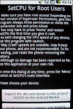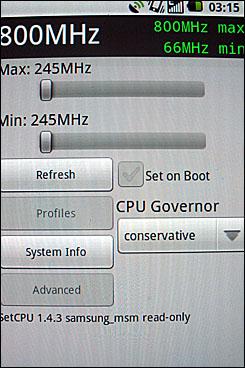 800mHz的处理器是一个双刃剑,一方面其高速的运算能力可以缩短系统响应时间,是运行多个程序的重要保障。但另一方面,主频的升高毫无疑问会增加电量的消耗。在日常的使用时,800mHz的主频就显得大材小用了。这时候,通过第三方软件SetCPU把暂时用不上的主频封印起来,在需要时才解封。可别小看这小小的环节,对于增加待机时间可是非常有效的。