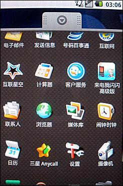 采用Android系统的三星i899放弃了三星全触控手机必备的TouchWiz的移植,不过TouchWiz的缺席,并没有影响到i899的触控感受。i899的Android系统界面与TouchWiz非常相似,同样可以桌面划分成不同的区域,通过向左或者向右滑动切换桌面,居中的主菜单预置了很多常用到的程序,如果觉得屏幕桌面Widget太多有点拥挤的话,还可以通过长按Widget程序拖动到两边的分菜单。