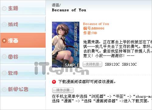 在继续提供主题、图片、铃声、应用程序之余,夏普福袋还特别增加了手机看漫画的功能,用户可通过手机上网的方式下载喜欢的漫画,事实上类似的功能在日本的年轻人中相当受欢迎。