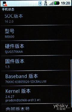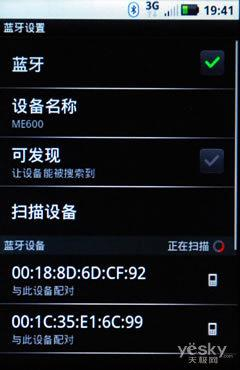 ME600采用WCDMA制式,支持HSDPA/HSUPA数据传输,内置Wifi模块、蓝牙2.0连接功能,启动WLAN功能后,可以快速识别无线路由状态,连接速度也较较为理想。由于系统版本的限制,该机还不能通过蓝牙实现本地文件的发送功能,需要安装辅助软件。