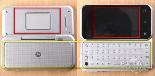 摩托罗拉这个看似“不羁”的设计,实际上是为了给手机的显示屏、键盘提供更大的空间。为了论证这个观点,我们特意将ME600翻过来,可以看到如果屏幕和键盘放在另一面,屏幕面积会缩水不少。