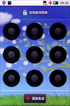 解锁方式,摩托罗拉ME600使用手势解锁,通过屏幕上9个点的组合,来形成一个类似“密码”的东西,笔者非常欣赏这个设计,因为在简便的前提下,ME600的解锁界面真的起到保护隐私的所用,组合错了,就进不了ME600系统。
