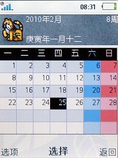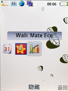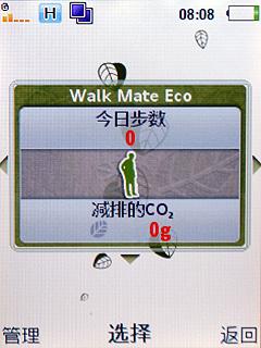 中间的键位为菜单键,点击“上”会出现一个菜单,可以在显示三种桌面, 分别为Calendar、开心网以及Walk Mate Eco。第一个功能也就是备忘录的意思,可 能是鼓励实用电子备忘而少使用铅笔。而第三个是一个可计算减排二氧化碳排放的计步 器,鼓励人们多多步行以减少城市中二氧化碳的排放。这几个程序也充分体现出了这款 手机的环保理念。