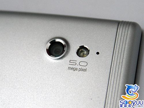 手机背面上方拥有一枚500万像素的摄像头并且支持自动对焦还有个LED补光灯,外形采用的是弧形面设计,与目前U5等设计风格相近,这样的设计使手机平放在做 面上的时候很容易发生旋转,好在背面电池盖采用的是磨砂材质,所以不必太担心发生磨损。