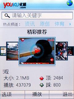 此外在视 频选项当中还有优酷视频,用户可以查看最新的视频短片,利用3G网络还是不错的体验。