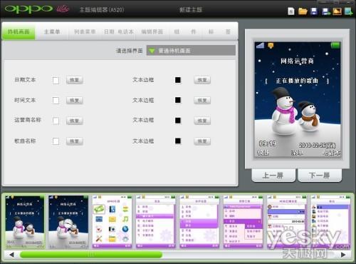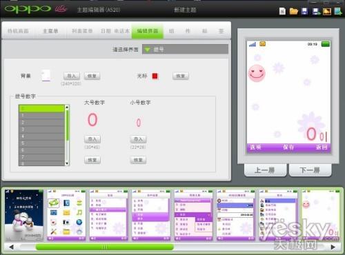 OPPO的主题编辑器在界面上比较容易上手,你可以按照不同的界面来对应修改不同的菜单位置。它按 待机画面、主菜单。列表菜单、日期、电话本、编辑界面、组件和标签,很直观地将OPPO手机系统上的各个子菜单区分编辑。并且还有预览功能,一眼望去一目 了然。