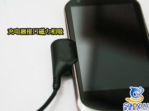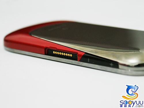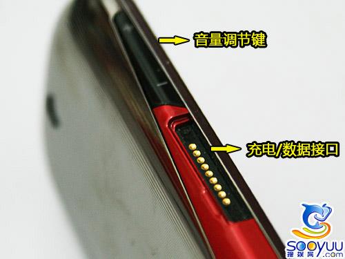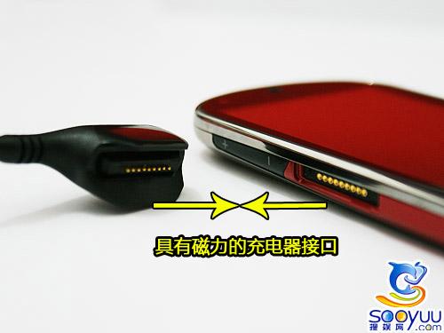 亮点就要说到机身左侧的部分了,上面黑色的部分是手机的音量键,下边有一个红色的盖子,用 手轻轻一抠居然掉下来了,虽然这个小盖子能保证手机的接口更加隐蔽的,但是不得不让我们担心意外遗 失的可能。红色小盖子里面是一排点状的金属触电。这就是乐Phone独特的电源/数据线接口。而更绝的 是手机与数据线的接口是具有磁力的,只要将两个端口靠近就会自动吸附上去,绝无仅有的设计。