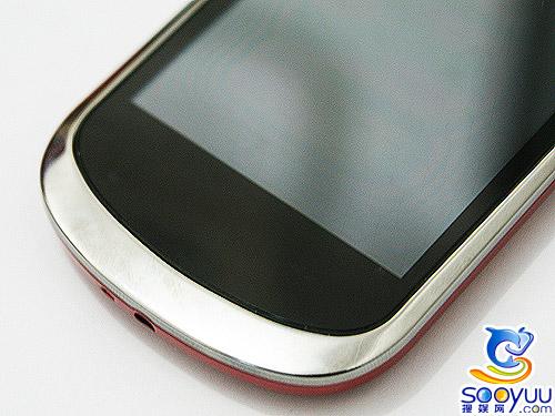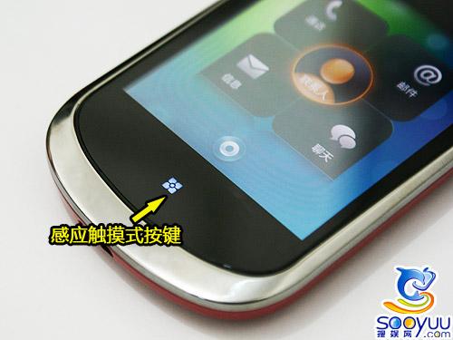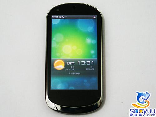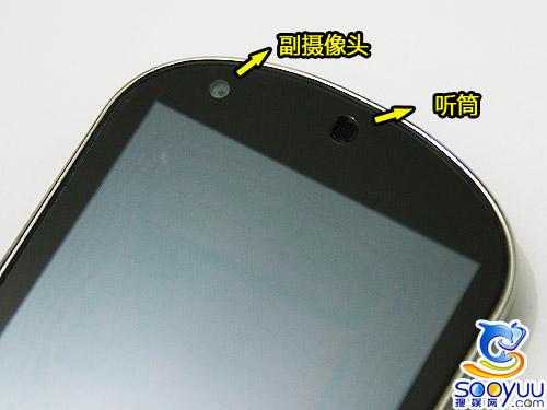 屏幕上方我们可以看到这款手机的听筒以及一个副摄像头。乐Phone支持中国联通WCDMA制式 的3G网络。而底部乍看上去什么都没有,不会比苹果的iPhone还要简洁吧。没有按键也能操作啊?实际上是隐藏了一个感应式的触摸键的。
