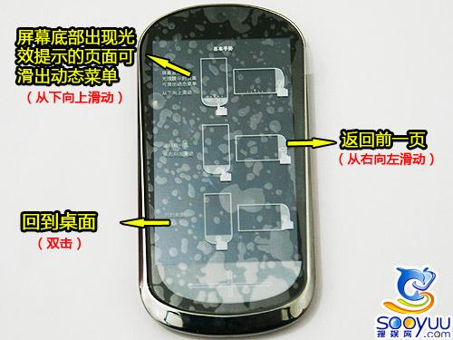 打开包装之后当然是迫不及待的拿出手机了,手机的正反面都贴了膜,上面介绍了关于这款手机特点的基本操作,看来乐Phone还真是与传统的Android相比有着很多改进啊。