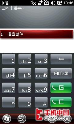 因为采用采用了Windows Mobile 6.5默认的UI,所以通话界面较为普通,但是我们从这里还是可以获得很多的功能,我们可以看到,这款还专门为双卡双待功能提供了两个拨号键,分别为G网拨号和C网拨号。