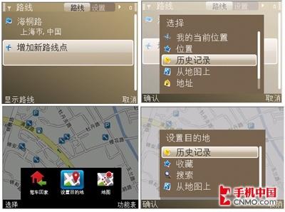 Ovi的“历史记录”可在两个地方出现,一是会出现在模拟导航“增加新线路点”时的屏幕菜单栏中;二是会出现在当选择进入“步行”或“驾驶”后的第二个选择项“设置目的地”中。