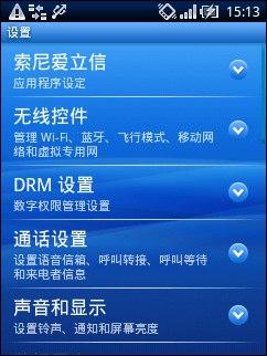 毫无疑问,索爱X10 Mini的Android系统与原生Android在设置菜单上并没有多大的不同,主要还是界面上改变了Android原生的黑白色彩搭配。设置菜单的首行还增加了索爱专属的个别应用程序设置。