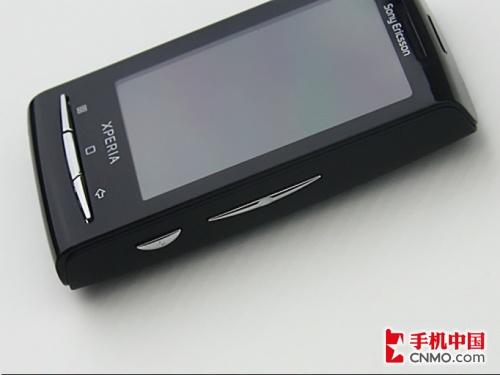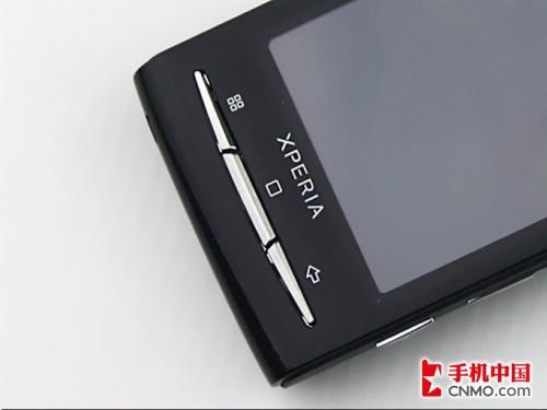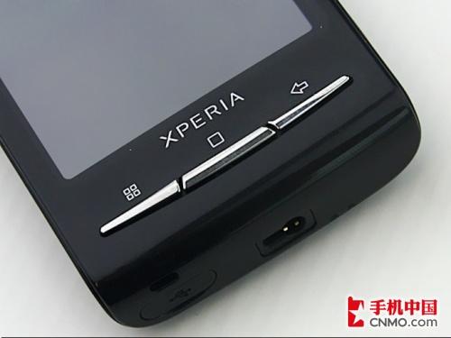 手机的正面设计相当简洁,并没有安排过多的按键,索尼爱立信X10 mini屏幕下方三个线性的功能按键延续了X10 mini的风格,亮银色弧状的按键让手机的正面拥有了不少的时尚韵味,从左至右分别为菜单键、Home键和返回键。