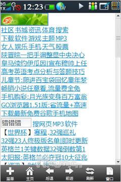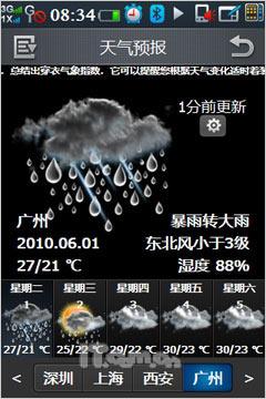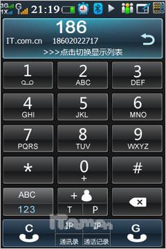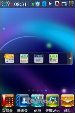 进入菜单界面后,我们看到酷派N92同样采用分屏显示的平铺式图标,屏幕下方则是几个常用功能快捷方式。在首个菜单界面中,还具有一个小的Widget控件,放置了天气、新闻、公告栏和Blog(博客)四个快捷方式,支持拖拽操作,用户也可进行自定义操作,比如将自己的Blog也编辑到此中来,随时随地分享自己的心情感受。至于天气预报与RSS新闻在首屏的出现自然是考虑到这两项功能的用户群很大。